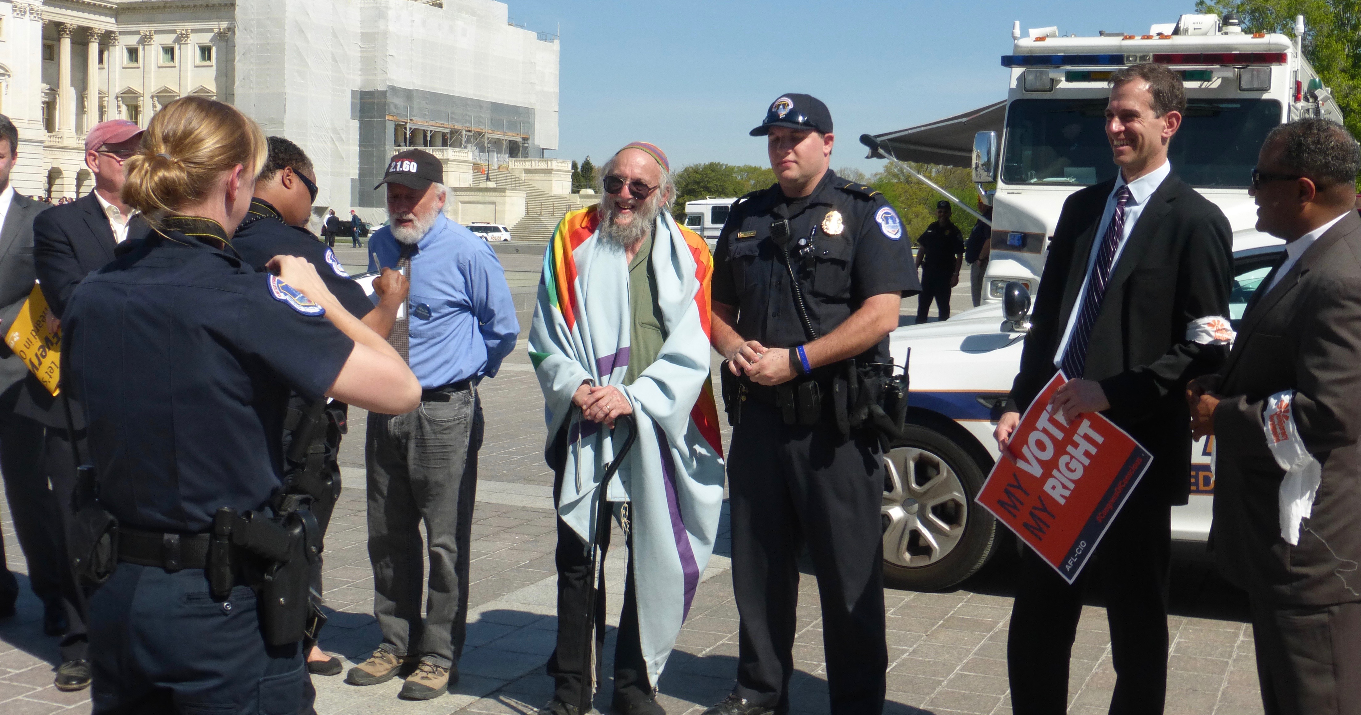 Sanders instantly responded, “The rabbi is right!” and laid out a strong program to halt global scorching. ^^^^^^^ II. One step backward in time: Last Monday morning, I was arrested among about 250 others who gathered on the steps of the US Capitol to block the entrances. We were demanding that Congress pass laws renewing and strengthening the Voting Rights Act of 1965 and creating new ways of getting Hyperwealth out of our elections. An attached photo shows the front line of the March as we approached the Capitol. Just before this photo was taken by Lynne Iser, Rabbi Mordechai Liebling was in the front line, and Rabbi Julie Greenberg just behind. Together with Pat Carolan of the Franciscan Action Network, Mordechai had led prayers at the rally just before the March began. Looming behind the front line is Sen Jeff Merkle of Oregon. On the left of the line is Rev. William Barber, prophetic voice and extraordinary organizer, founder of Moral Monday & head of North Carolina NAACP. Then, from Left to Right: Tefere Gebre, executive vice president of the AFL-CIO. Chris Shelton, president of the Communications Workers of America Me. I am wearing sunglasses and the Rainbow tallit that my mother sewed for me for my 50th birthday, almost 33 years ago. It symbolized then and now (from the Torah’s story of the Flood) the commitment of the Holy Unity that breathes all life, to give us the wisdom to make sure that never again would the earth be drowned and all life be endangered. I have worn it into every one of my arrests since then. (You can see the Rainbow design better in the next photo, of my arrest.) Cornell William Brooks, president of the NAACP. Annie Leonard, executive director of Greenpeace. Aaron Mair, president of the Sierra Club. The arrests were benign, as you can see from the photo attached. Not even handcuffs, and we were soon released. More dangerous than the arrests themselves was the almost total blank-out in the “mainstream” media of ten days in which there had been more than one thousand arrests at the Capitol, capped by an extraordinary coalition of labor, African-American, Hispanic, GLBTQ, earth-protective, and good-government / pro-democracy organizations. We share the conviction that the damage to democratic elections stands in the way of each of our distinctive concerns for a just and peaceful world of sustainable and shared abundance -- - and therefore must be opposed by all of us in unison. What does it mean that the media are blanking out these actions, even though they are led by an unprecedented array of leaders and their organizations – all in defense of the heart of democratic process? How do we break through that wall of silence? Should we have blocked the bridges to DC, brought the undemocratic government to a momentary halt as if we were a human snowstorm? Should we have gone on Pilgrimage inside the Capitol, doing our sit-down in a hundred different offices? Or ---- ?? III. Backwards again in time: Ten days before Passover, the National Museum of American Jewish History held its fourth annual celebration of "The Freedom Seder Revisited.” As the author of the original Freedom Seder almost 50 years ago, I was invited to speak. I arrive to discover from the welcoming program booklet that the most important sponsor of "Freedom Seder Revisited” besides the Museum itself was PECO, the electric-power distribution company for Philadelphia. They buy electricity from various producers – mostly coal-burners – and deliver it to the city. And I knew that EQAT, the Earth Quaker Action Team, has challenged PECO to begin transforming its business model. EQAT is urging PECO to finance a strong pro-solar, pro-job program in a starkly impoverished North Philadelphia neighborhood. PECO would pay to hire and train disemployed workers to install solar collectors, and would pay households to install them. The challenge, I know, comes due in just a few weeks. The original Freedom Seder broke with frozen habit, in the Seder’s ritual form and in the content of its political challenge to the status quo. On this night of revisiting it, how do I challenge PECO into change rather than hostility? So this is what I said in my brief talk: In the original Exodus story, Pharaoh’s Daughter faced a moral choice when she saw the baby Moses floating in the Nile. (See a dreamy image of that moment in an attached photo.) She chose to step beyond her role as a highly privileged and powerful person. And the choice only began there. The ancient rabbis taught that Pharaoh’s daughter joined the Exodus along with the rag-tag runaway slaves – making up a “mixed multitude” that marched into the Wilderness. She was renamed “Bat-Yah,” not Pharaoh’s daughter but Daughter of the God Who breathes all life. So, I asked, would PECO change its life-path as Pharaoh’s Daughter did in the ancient story?