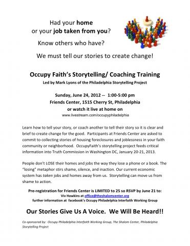 - Beginning during May—especially aiming at a public start-up Tuesday May 29 (after Memorial Day and the festivals of Shavuot and Pentecost)—and continuing through the rest of the year, congregations and Occupy Faith groups will carry out story-telling sessions to collect testimony about economic injustice in people’s own lives. Occupy Faith will issue guidelines for gathering testimony and create a website so video of the testimonies can be posted. Stories might include people whose homes had been foreclosed, people who had been disemployed, people devastated by health care costs, students who can’t afford the new costs of public colleges or who are facing enormous debt burdens with very iffy job prospects, etc